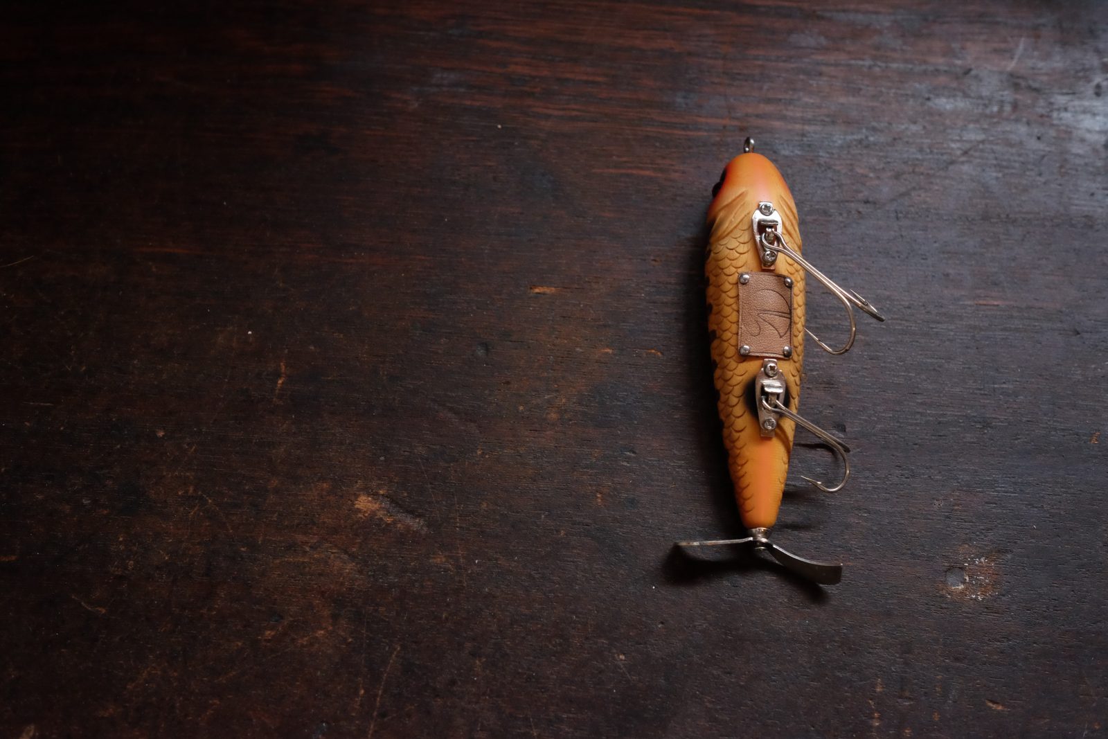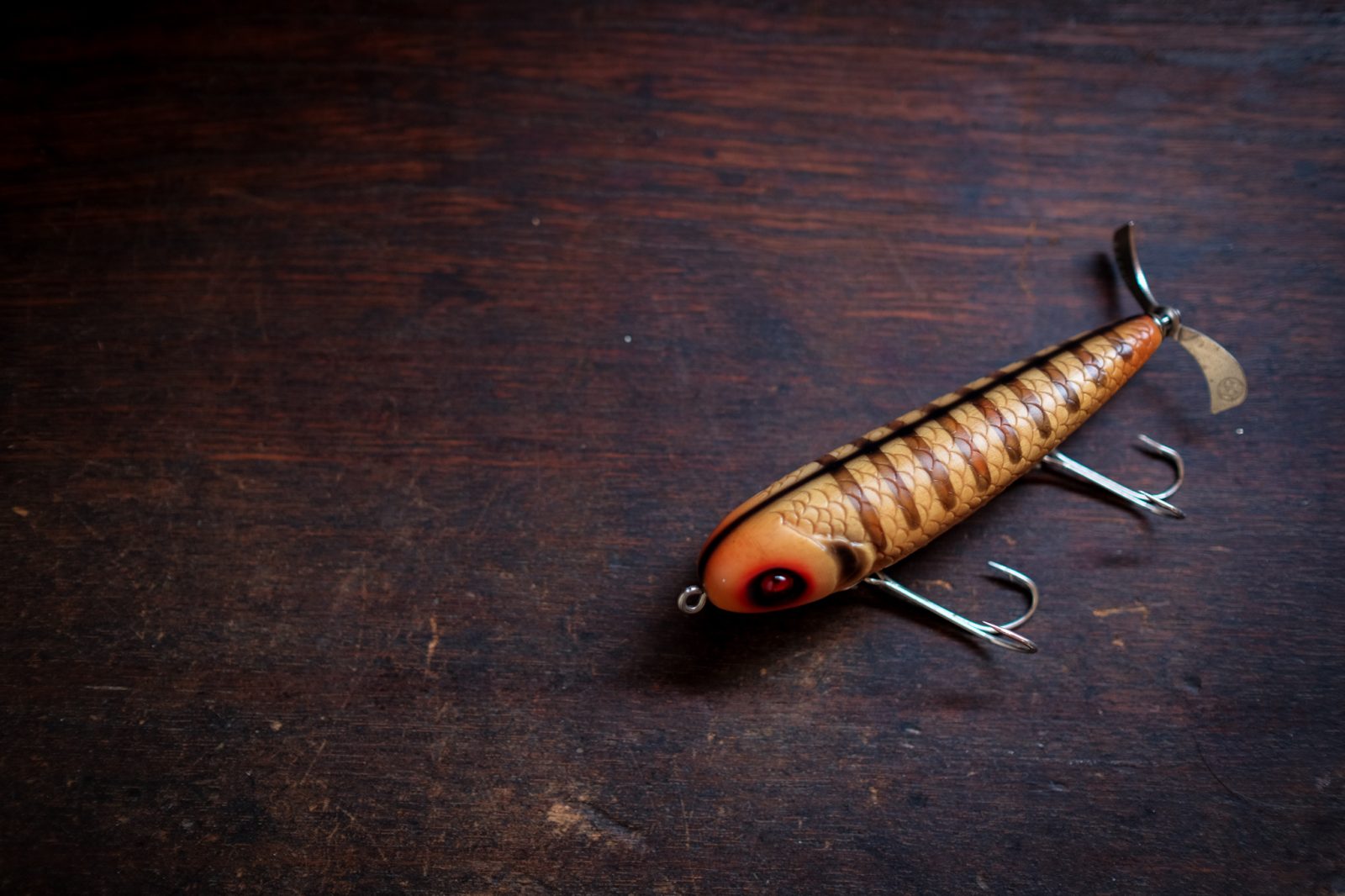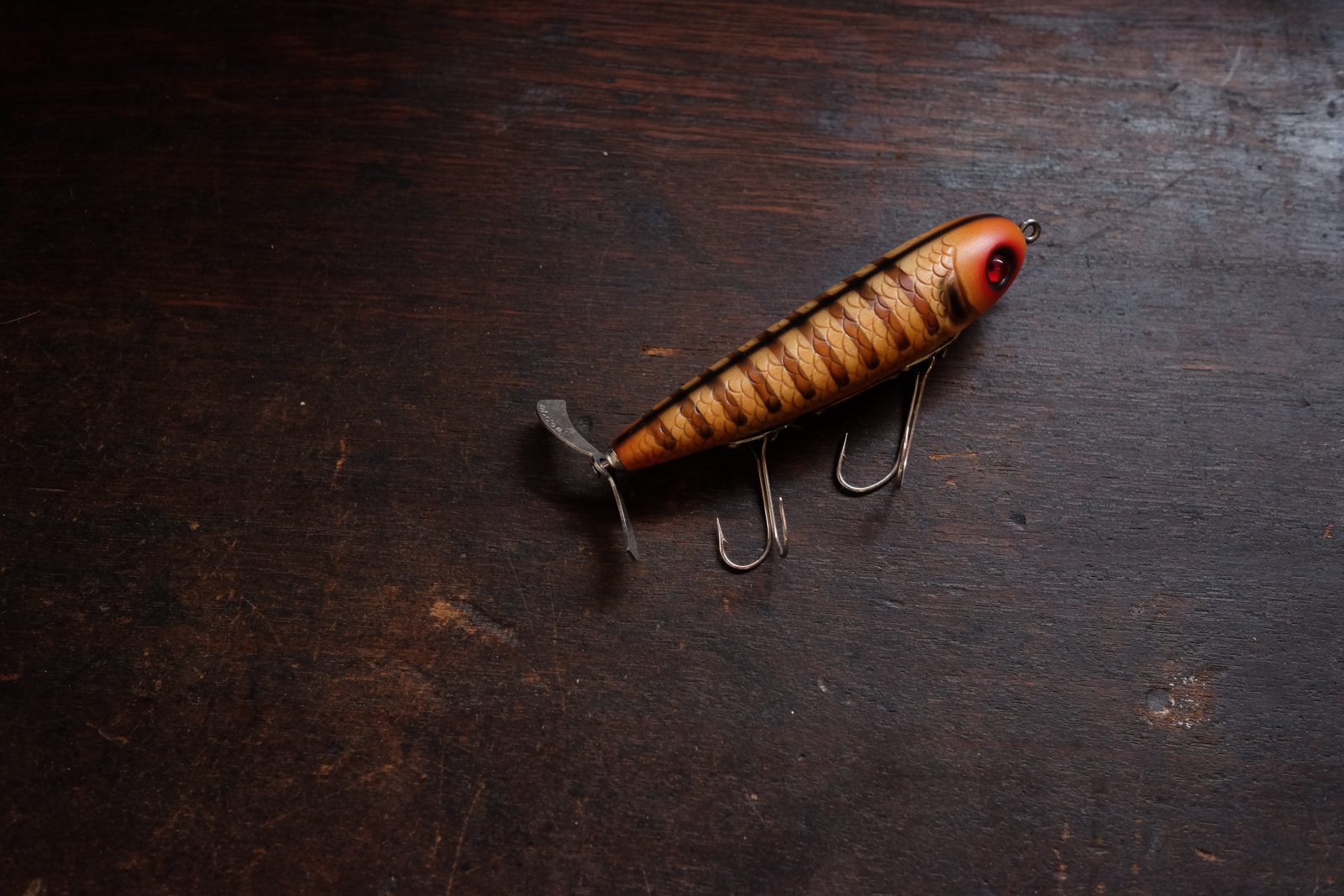 The special upward-swooping body shape also performs turns as nicely as a pencil bait, despite being a rear single-prop bait. The name comes from its ability to dive underwater and use its highly buoyant head to move like a torpedo firing when strongly acted upon at a moment’s notice.